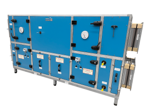 Highly efficient heat recovery via plate heat exchangers (aluminium, hygroscopic membrane). The warm and cold air flows are directed past each other in the counterflow plate heat exchanger, whereby the heat is transferred. In the transition area or in case of frost, a partial airflow of outside air is directed past the exchanger (regulated by bypass flap). Additional heating if required with pump warm water (PWW) and optional cooling. Fans with EC motors for needs-adjusted air volumes. Temperature regulation via the compact